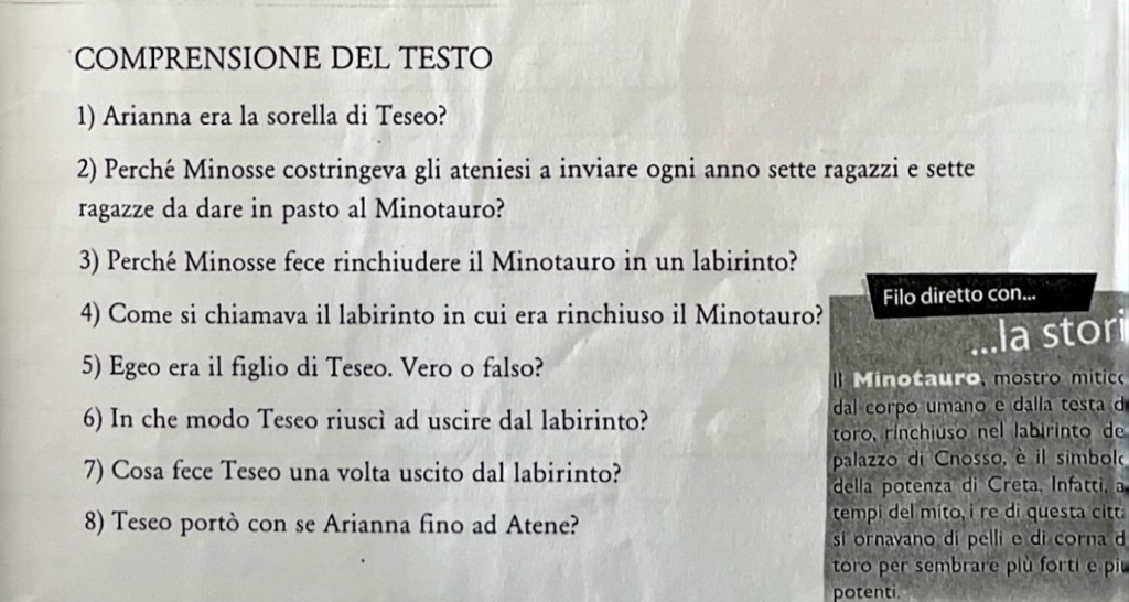 Dopo un po’ di tempo è arrivata la prof. Bottari che ci ha spiegato l’inizio della guerra di Troia e l’Iliade. È stata molto interessante. Dopo un po’ la maestra Flavia ha interrogato, io sono andato benissimo. Poi siamo andati a mensa, era molto più buona di quella della nostra scuola. Ho incontrato molto dei miei amici.
